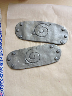 Das Stirnband machte ich mit Hilfe von Fimo. Dazu nahm ich silbernes Fimo und wälzte es aus. Dann schnitt ich die richtige Form heraus, schnitzte das Konoha-Zeichen rein und machte noch diese kleinen Schrauben.
